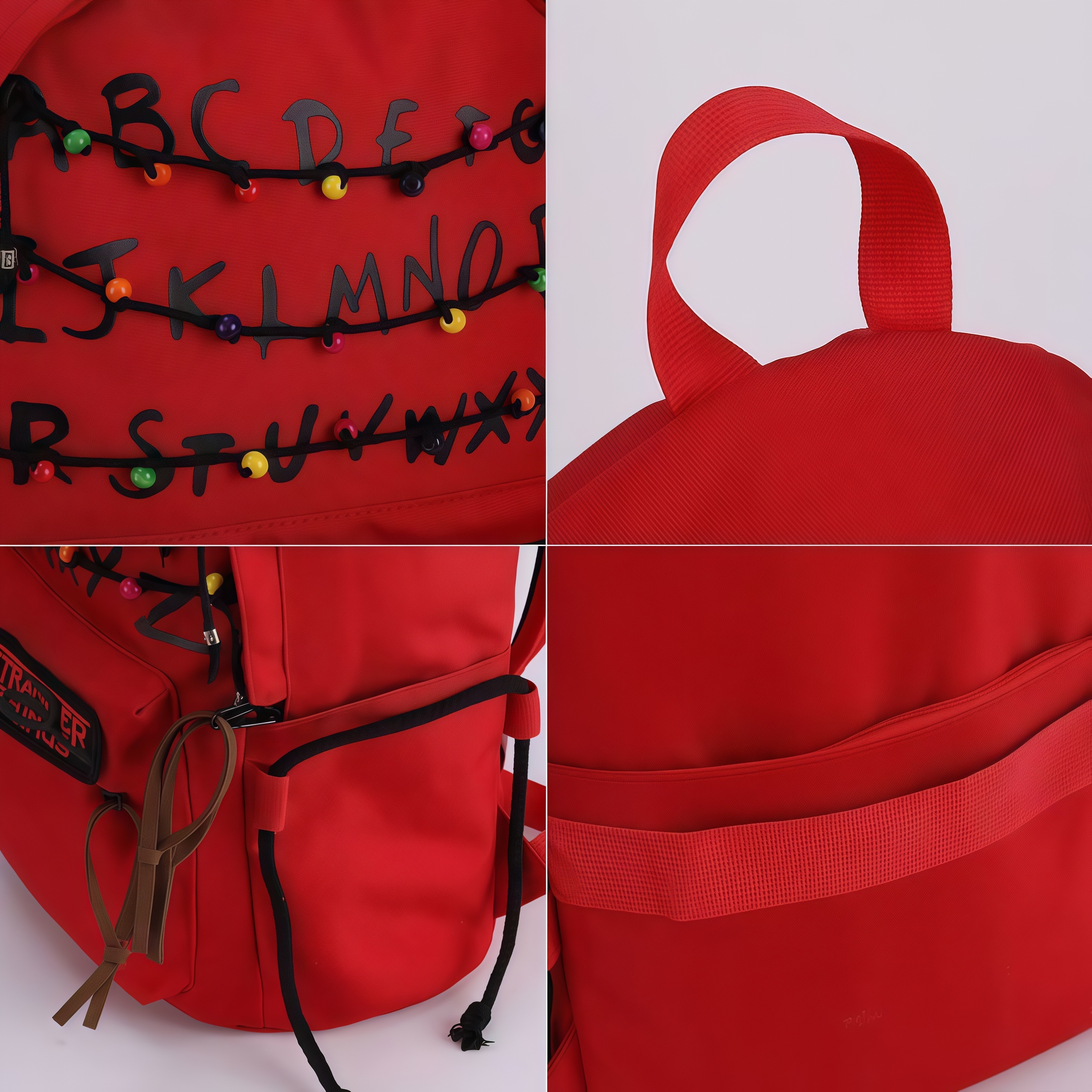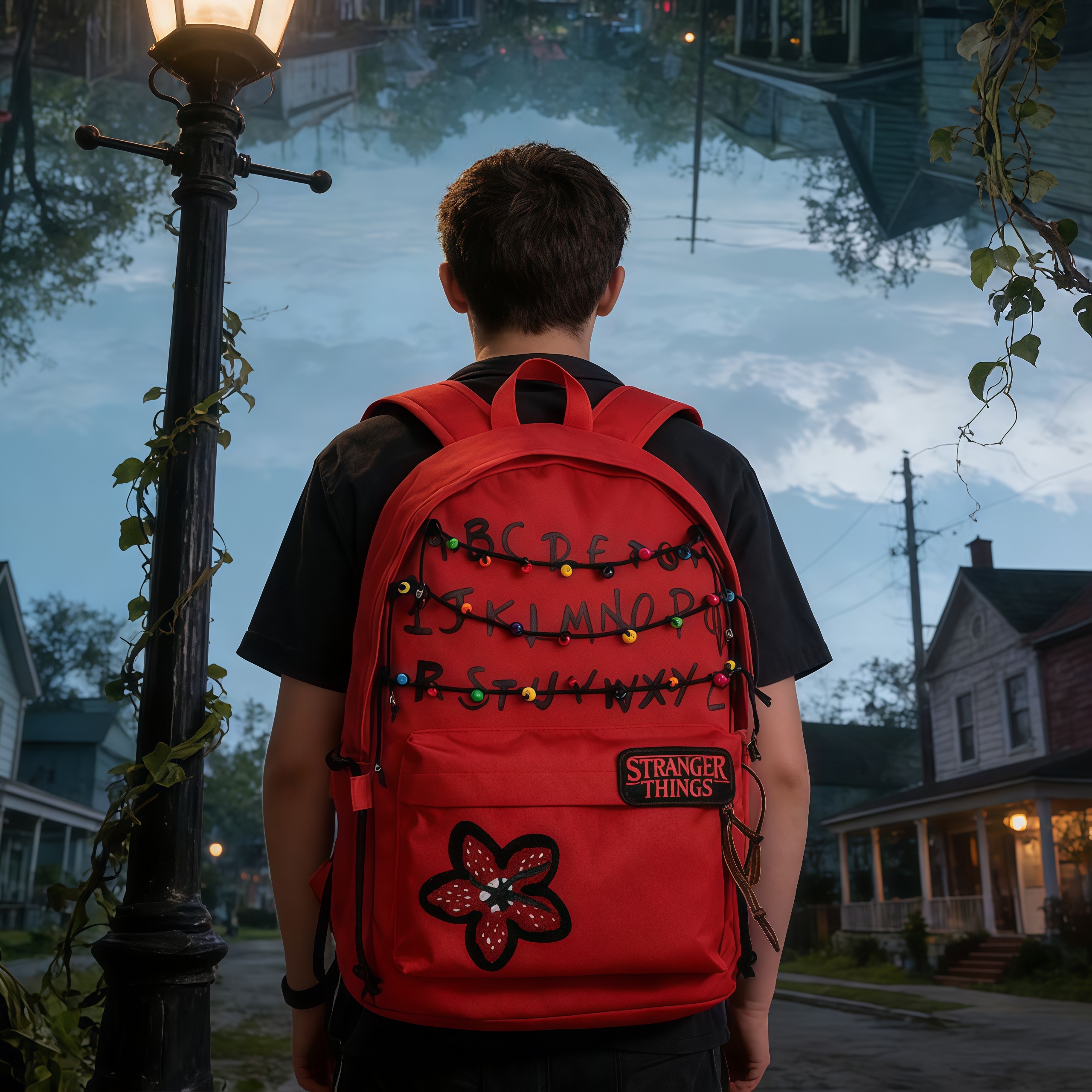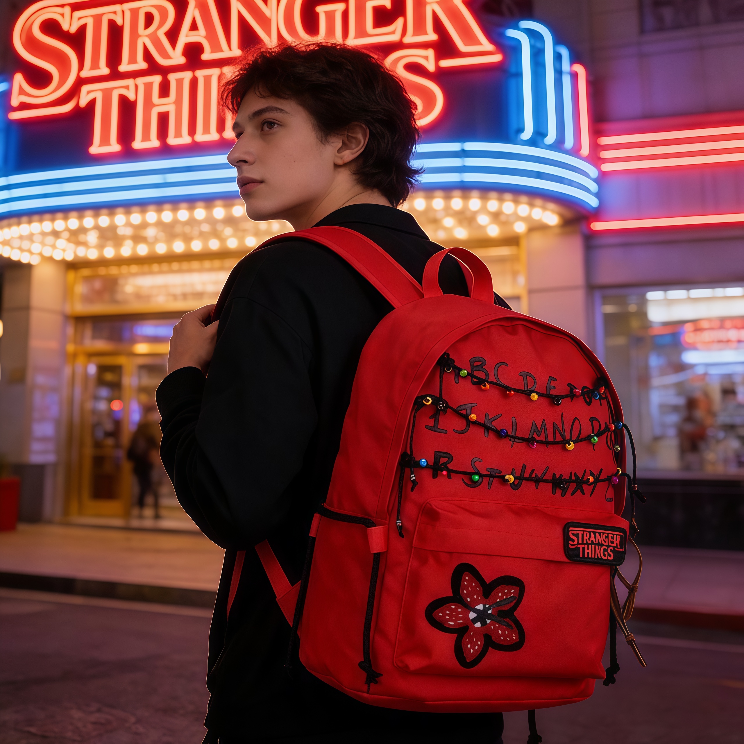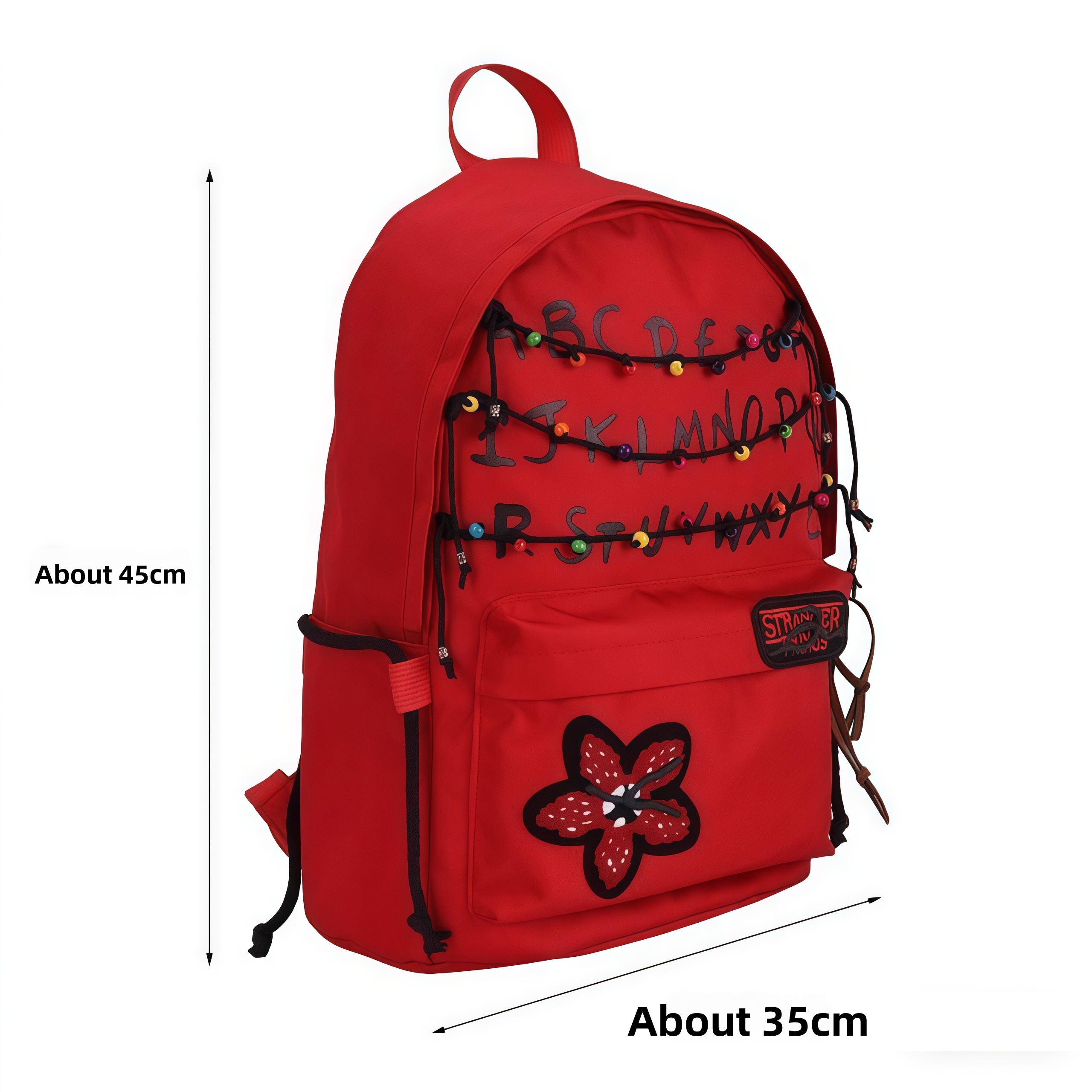 This 'Stranger Things' themed backpack is a \"Upside Down\" essential designed specifically for fans of the series. The main visual features iconic red letter string lights that recreate the show's mysterious atmosphere, with each colored bead seeming to whisper the secrets of 'The Upside Down'. The front showcases a 'Stranger Things' metal badge paired with a Demogorgon flower embroidery, boasting meticulous details and high recognizability. · The included glowing bulb pendant emits a faint blue light in the dark, as if随时 ready to open a portal to another dimension. · With a large main compartment and front pockets, it seamlessly combines daily commuting needs with fan outings, letting you carry the mysterious vibe of Hawkins Town wherever you go.