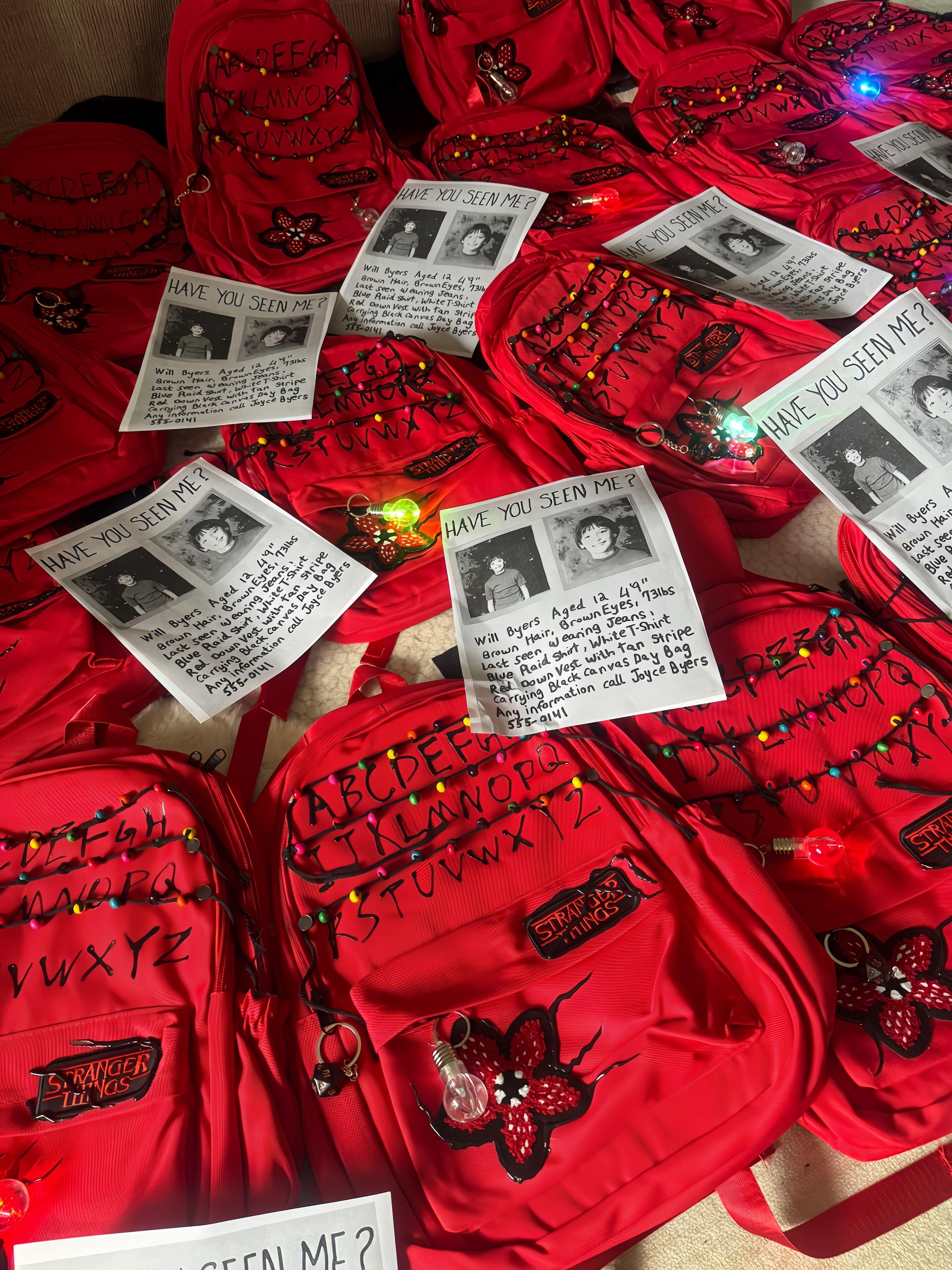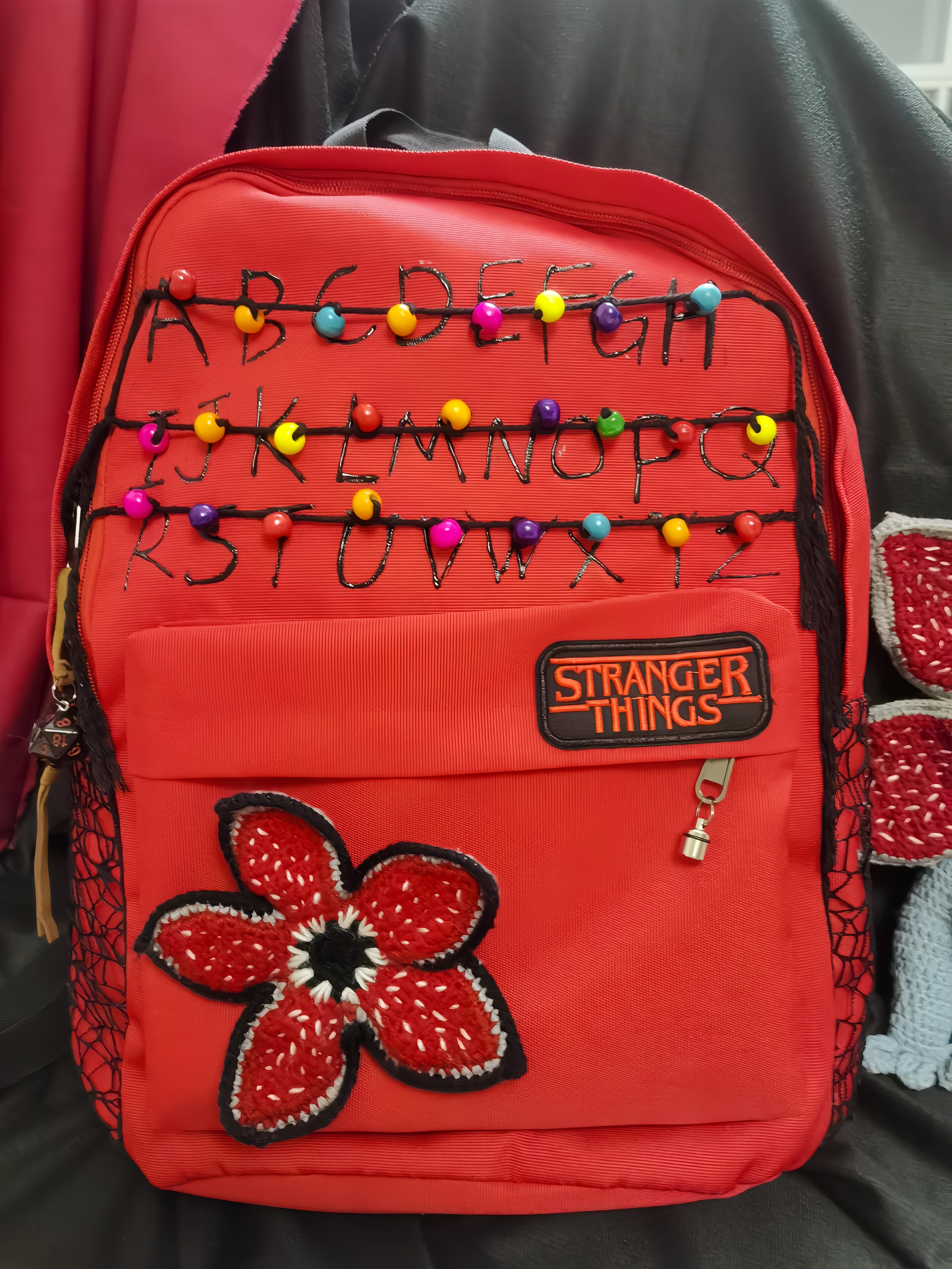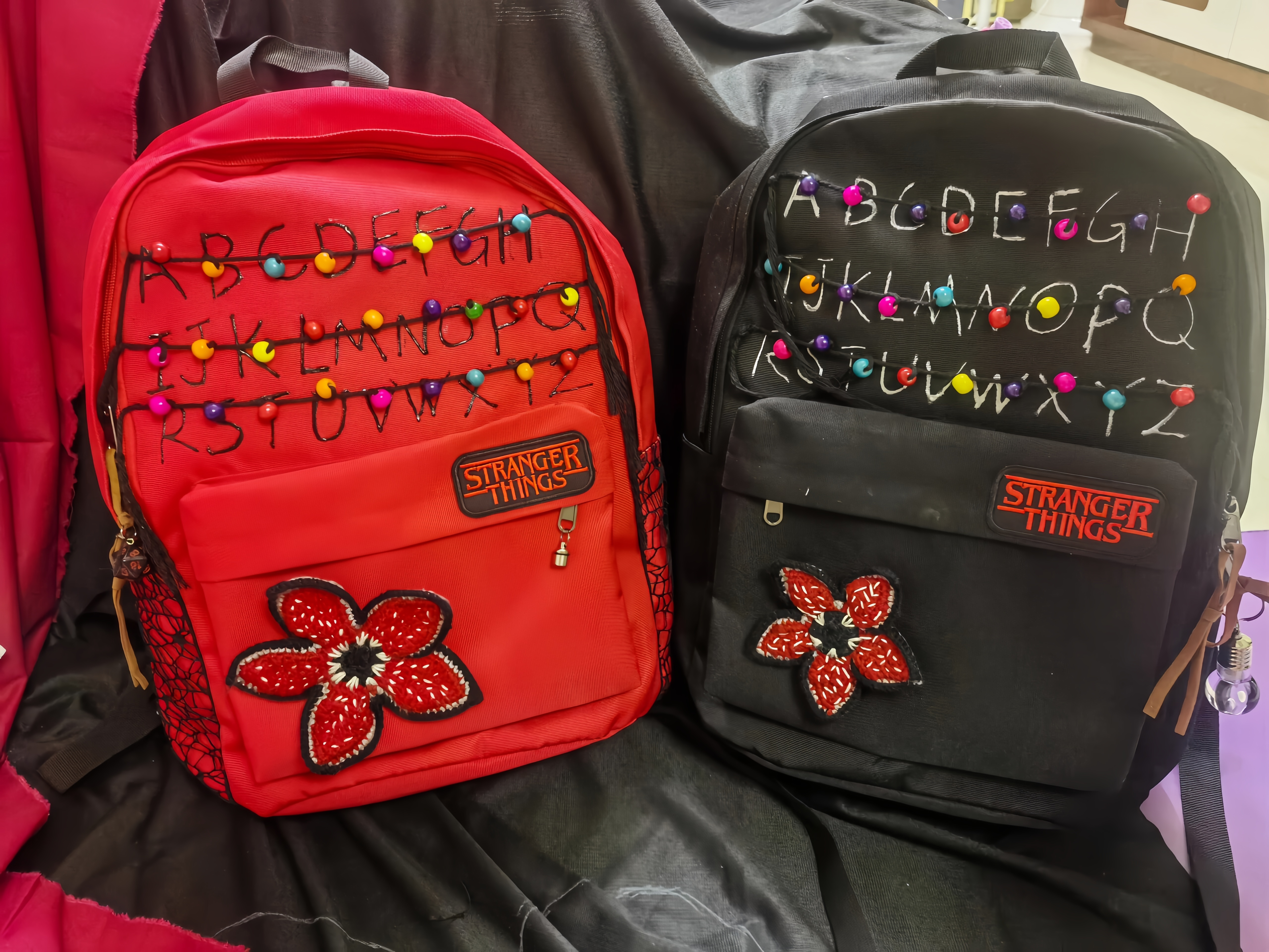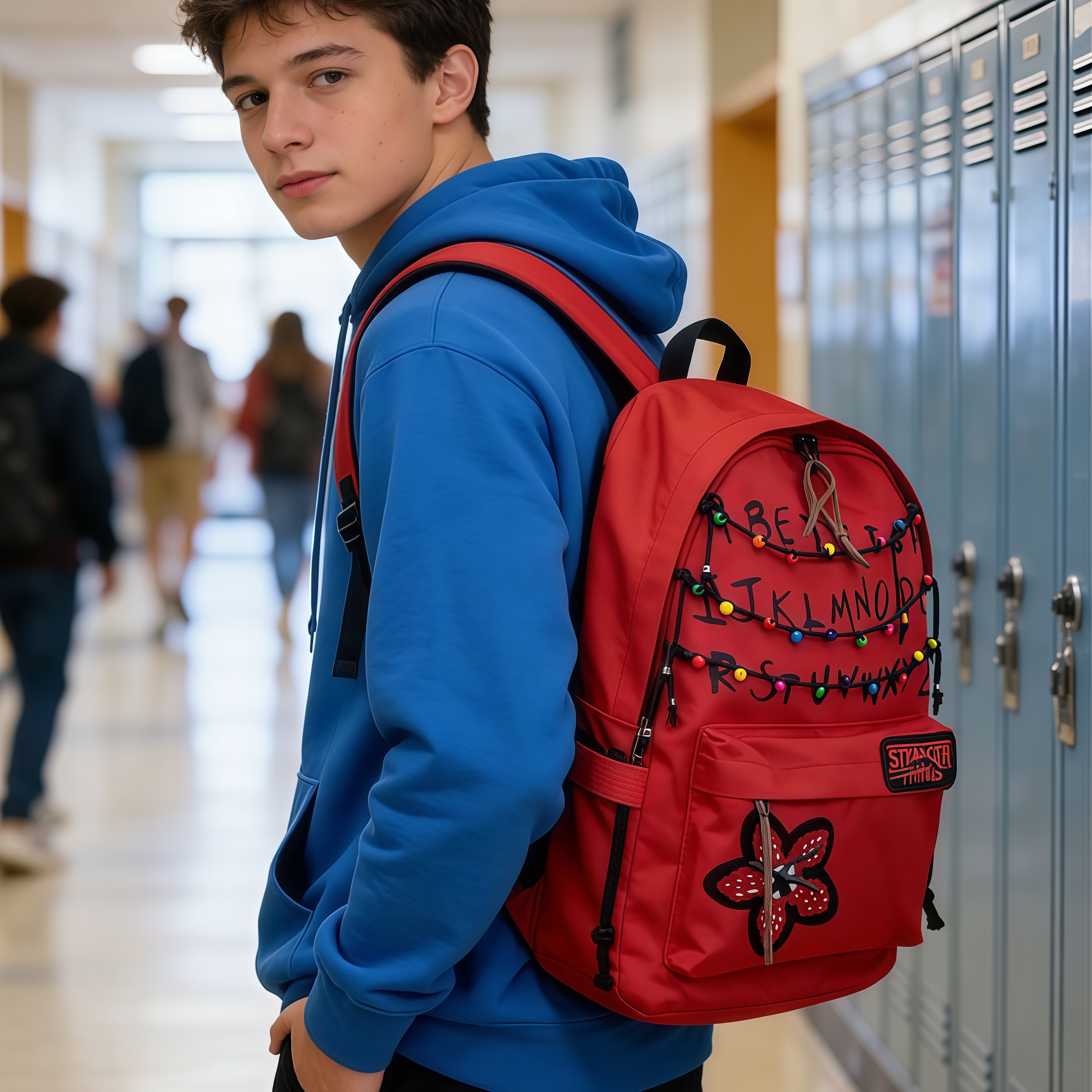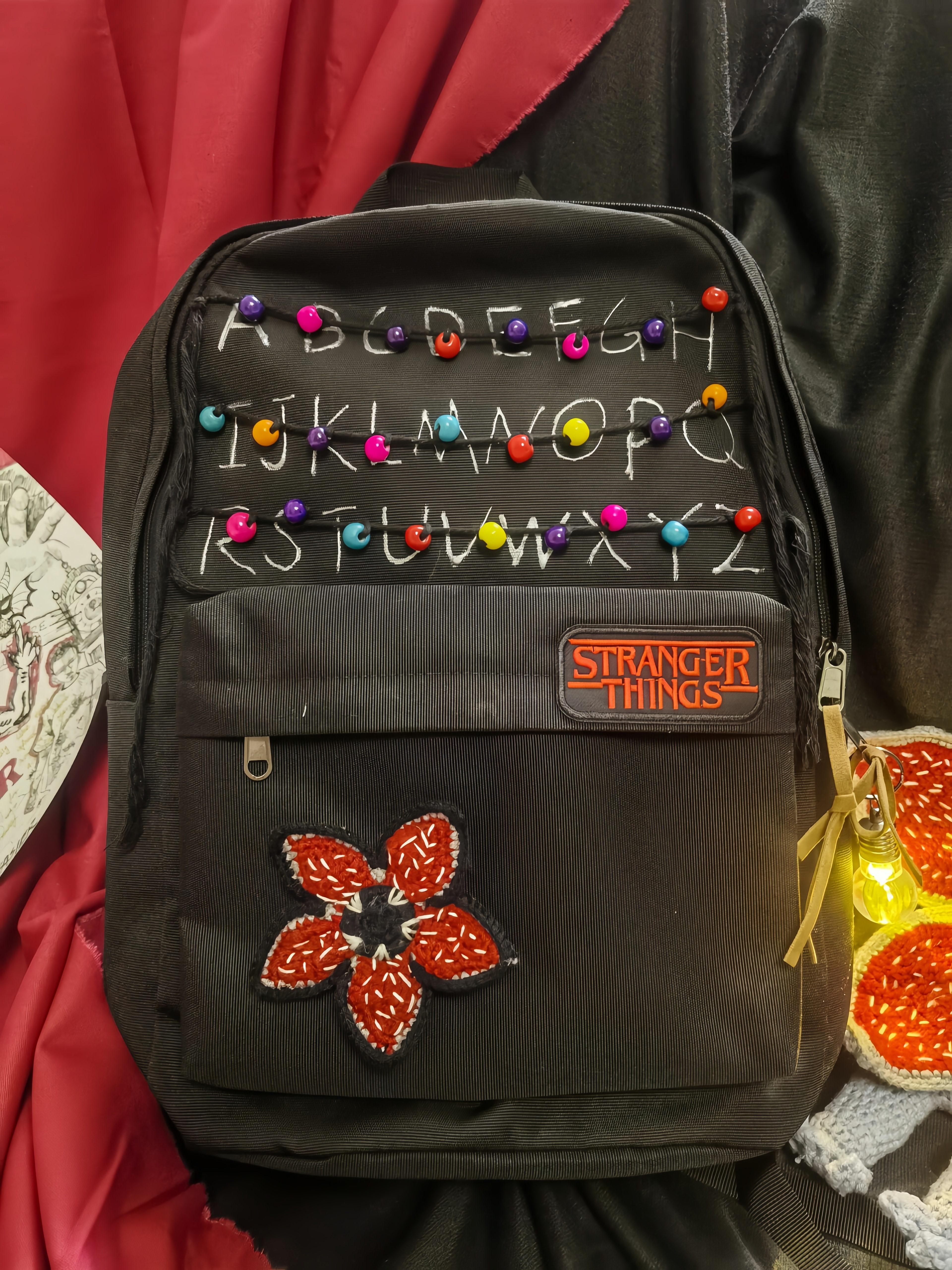 This 'Stranger Things' themed backpack is a \"Upside Down\" essential designed specifically for fans of the series. The main visual features iconic red letter string lights that recreate the show's mysterious atmosphere, with each colored bead seeming to whisper the secrets of 'The Upside Down'. The front showcases a 'Stranger Things' metal badge paired with a Demogorgon flower embroidery, boasting meticulous details and high recognizability. · The included glowing bulb pendant emits a faint blue light in the dark, as if随时 ready to open a portal to another dimension. · With a large main compartment and front pockets, it seamlessly combines daily commuting needs with fan outings, letting you carry the mysterious vibe of Hawkins Town wherever you go.