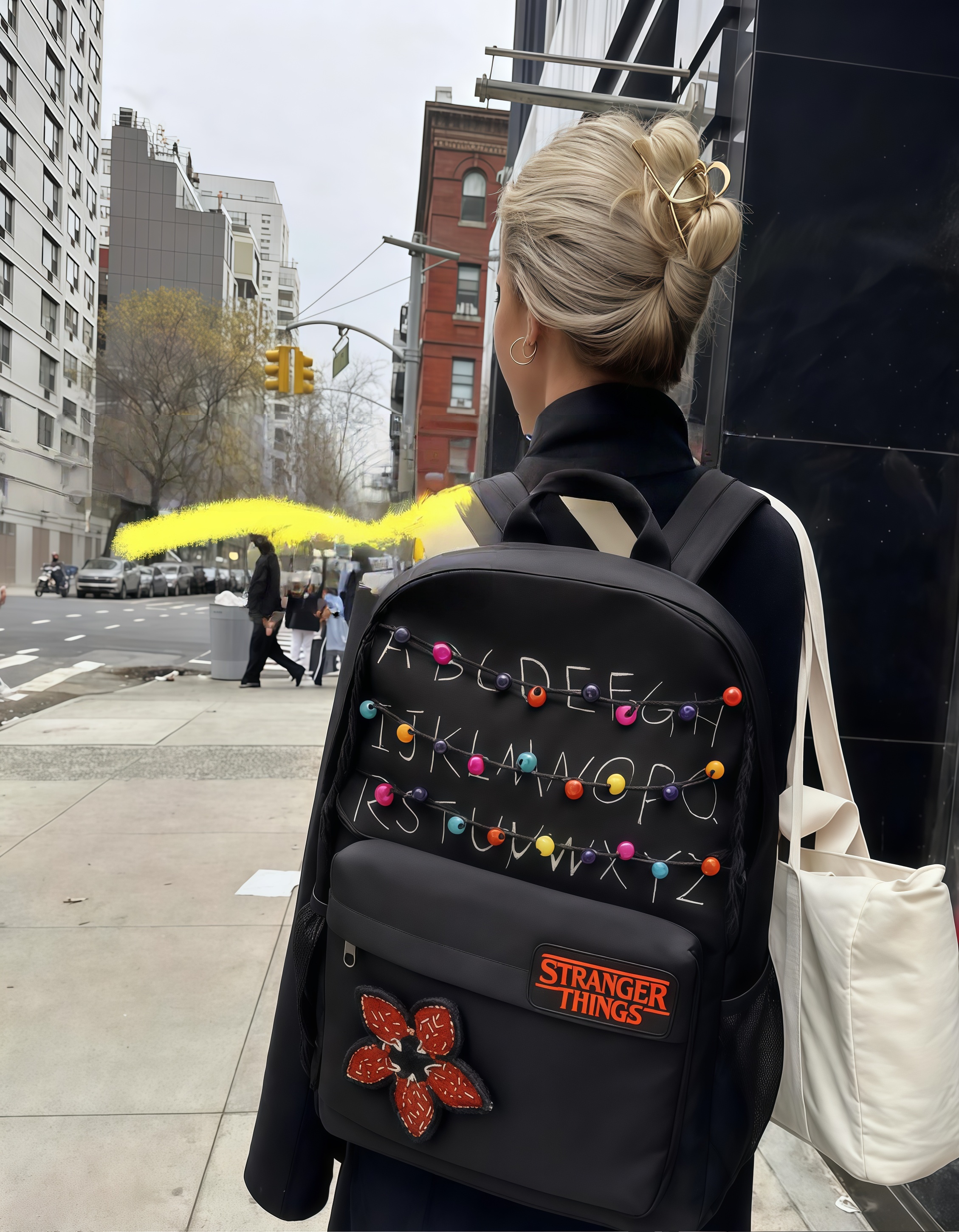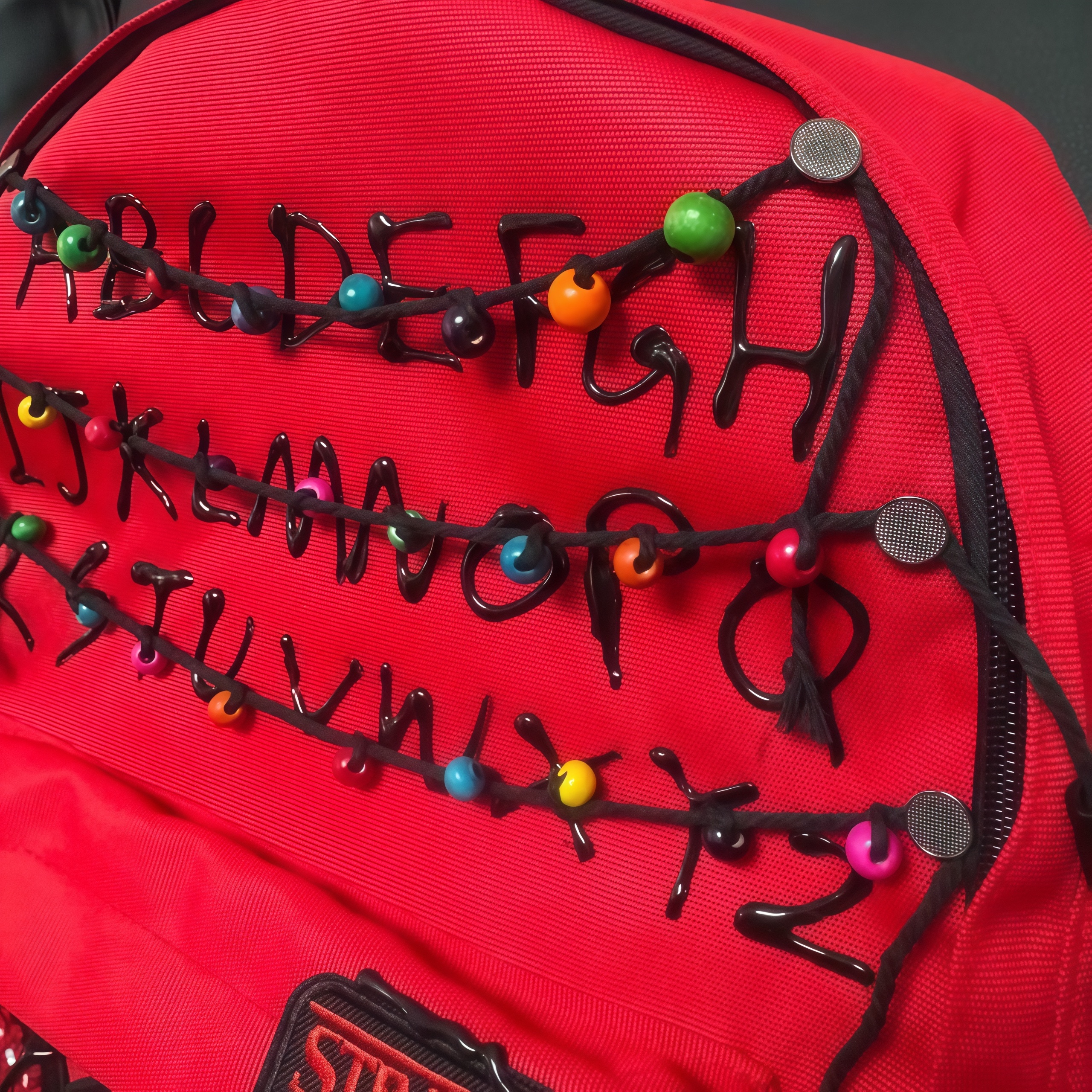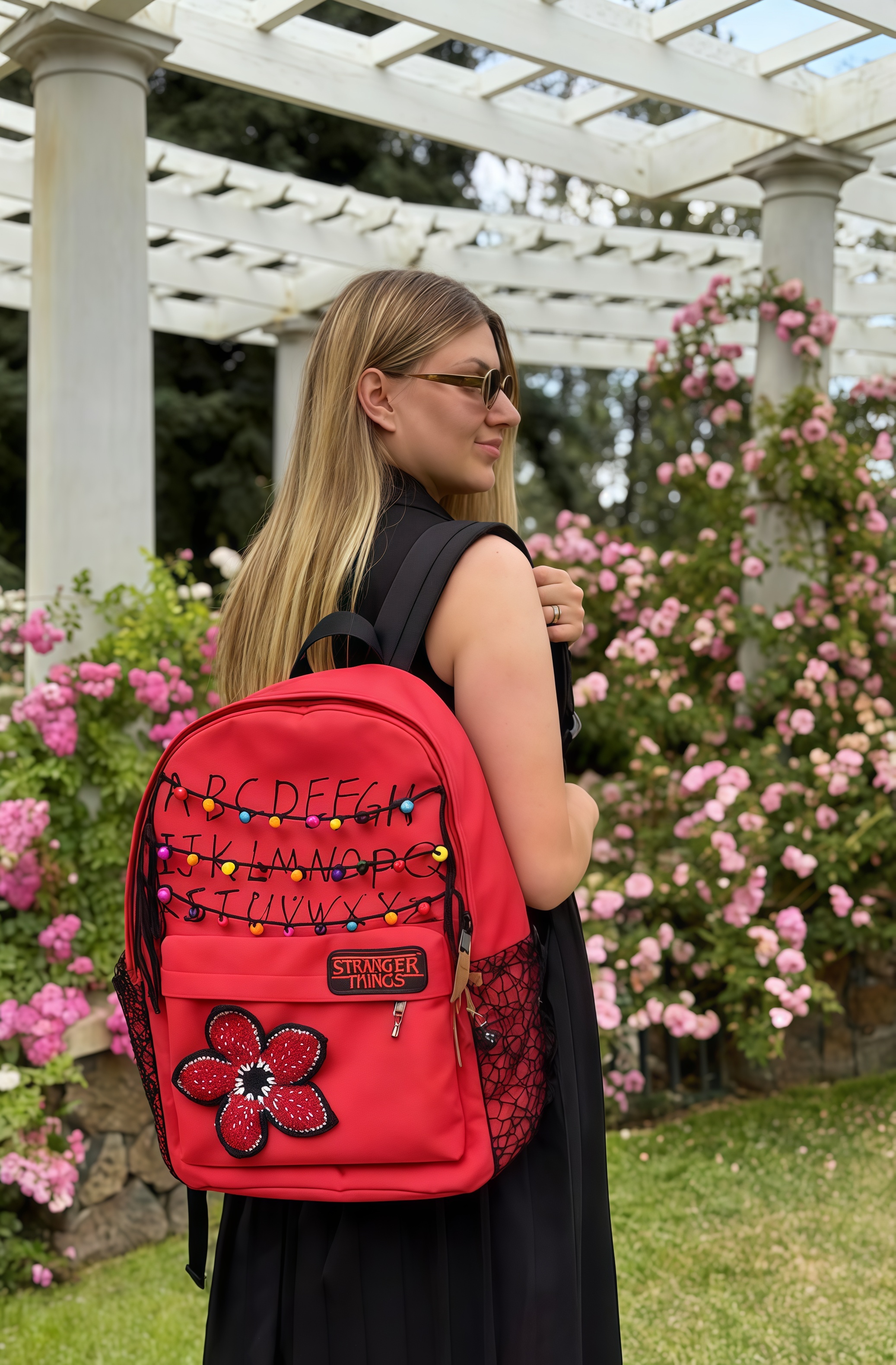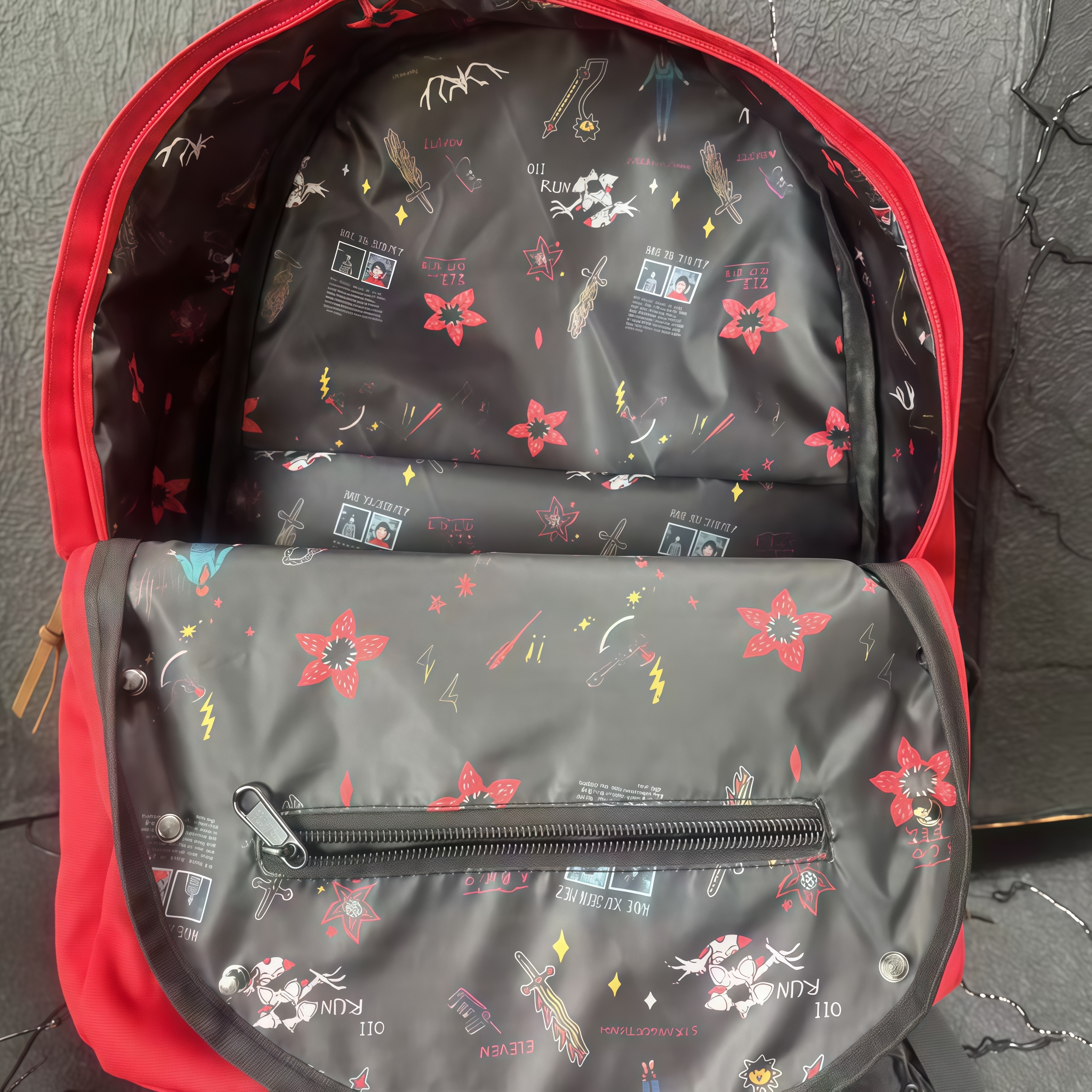 This 'Stranger Things' themed backpack is a \"Upside Down\" essential designed specifically for fans of the series. The main visual features iconic red letter string lights that recreate the show's mysterious atmosphere, with each colored bead seeming to whisper the secrets of 'The Upside Down'. The front showcases a 'Stranger Things' metal badge paired with a Demogorgon flower embroidery, boasting meticulous details and high recognizability. · The included glowing bulb pendant emits a faint blue light in the dark, as if随时 ready to open a portal to another dimension. · With a large main compartment and front pockets, it seamlessly combines daily commuting needs with fan outings, letting you carry the mysterious vibe of Hawkins Town wherever you go.